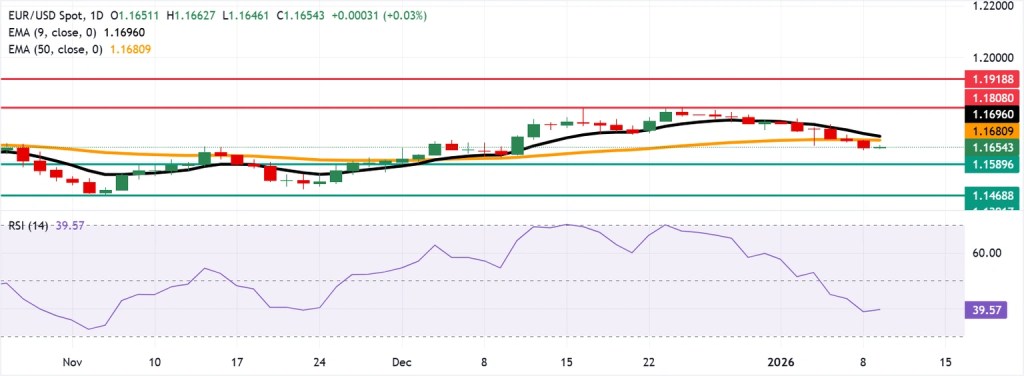 EUR/USD steadies near 1.1650 during Asian trading on Friday, following a five-day losing streak. The 14-day Relative Strength Index (RSI) sits at 39, indicating bearish momentum that is weakening rather than signaling oversold levels.