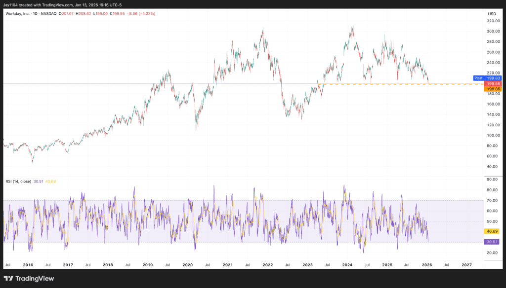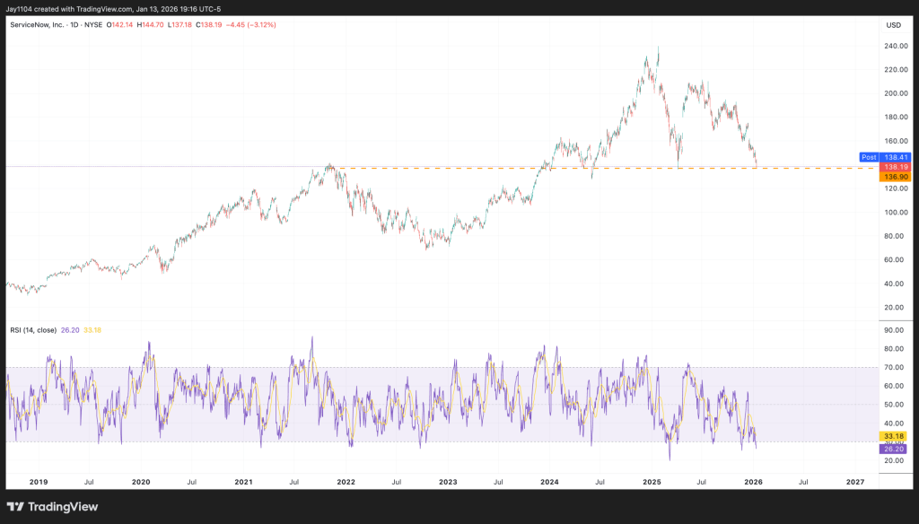 Software stocks took a severe hit. Shares of Salesforce (NYSE:CRM), ServiceNow (NYSE:NOW), and Workday (NASDAQ:WDAY) were heavily battered. Notably, ServiceNow has fallen back to its 2021 highs, which also align with the lows seen in April 2025.