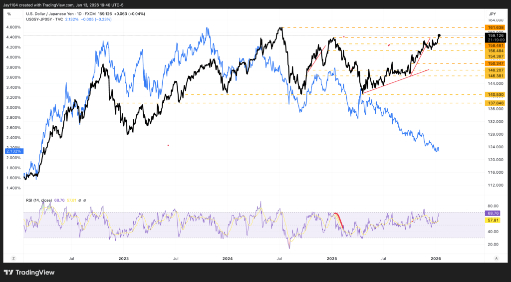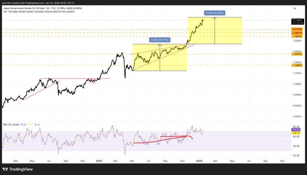 If you’re looking for rising yields, Japan is where to focus. The 10-year JGB continues its steady ascent and is now around 2.17%. Based on the wedge pattern and a forward projection, the yield could push toward 2.25%.