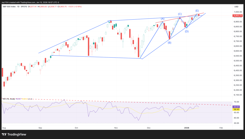 Today may bring another chance for the Supreme Court to issue a ruling on tariffs—we’ll know around 10:00 a.m. whether an opinion is released. The timing is notable for equities, as the S&P 500 is tightly consolidating and approaching a point where it must break in one direction. I still believe the setup looks more like a market top than the beginning of a melt-up. Technically, it could even be interpreted as a terminal diagonal triangle.