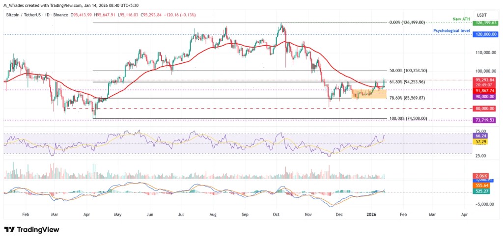 Bitcoin found support near the former upper consolidation zone around $90,000 on January 8 and showed a modest recovery through Monday. On Tuesday, BTC surged over 4%, closing above the 61.8% Fibonacci retracement level—measured from the April low of $74,508 to the October all-time high of $126,199—at $94,253. As of Wednesday, Bitcoin is trading near $95,300.
