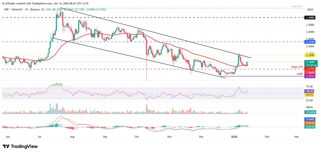 XRP found support near its 50-day EMA at $2.07 last week and remained around that level through Monday. On Tuesday, XRP climbed over 5%. As of Wednesday, it is trading close to $2.16.