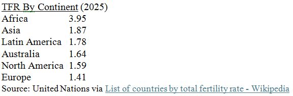 Demographers use the “total fertility rate” (TFR), defined as the average number of births per woman, as a key measure of population sustainability. A TFR of at least 2.1 is required to maintain a stable population, with the additional 0.1 accounting largely for infant mortality. Although the global TFR stood at 2.24 last year, this figure masks significant regional disparities. Excluding Africa, the global fertility rate falls well below 2.0.