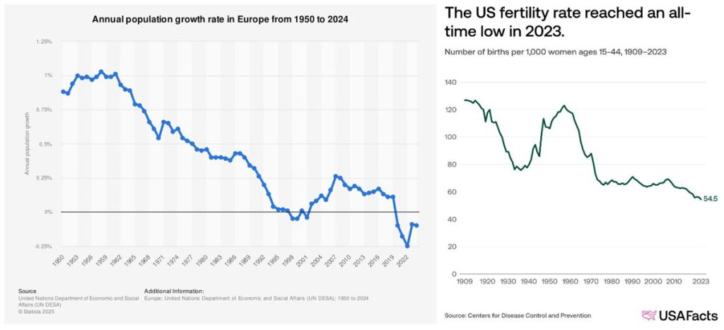 Europe faces an even steeper demographic challenge. With an average fertility rate of just 1.4 children per woman and a comparatively generous system of old-age pensions, the region confronts mounting fiscal pressure. These constraints help explain Europe’s historical reliance on the United States for security spending—a strategy that may prove risky as President Donald Trump presses European nations to assume greater responsibility for their own defense.