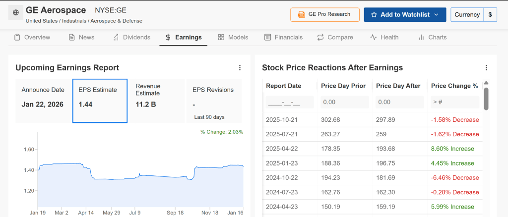 The company is scheduled to release its fourth-quarter update before the market opens on Thursday at 6:30 a.m. ET. Options markets are bracing for heightened volatility, with implied pricing suggesting a post-earnings move of approximately ±5.2% in GE shares.
