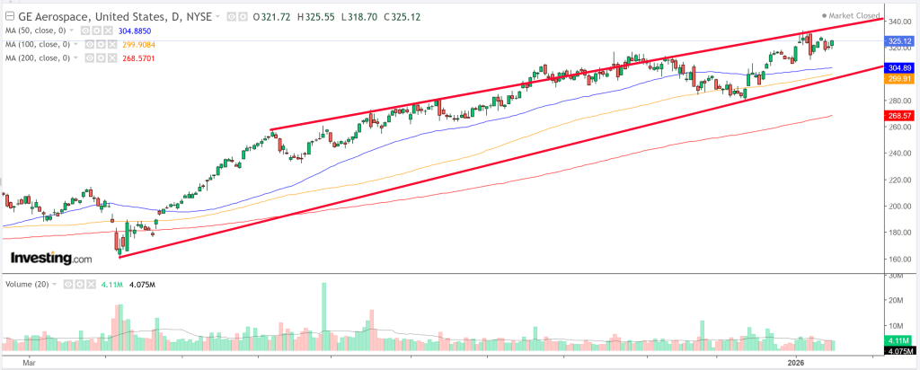 GE remains in a strong upward trend, with its share price up 78.8% over the past year and trading just 2.3% below its 52-week high. Momentum indicators continue to point higher, with technical signals flashing a “strong buy” across multiple timeframes.