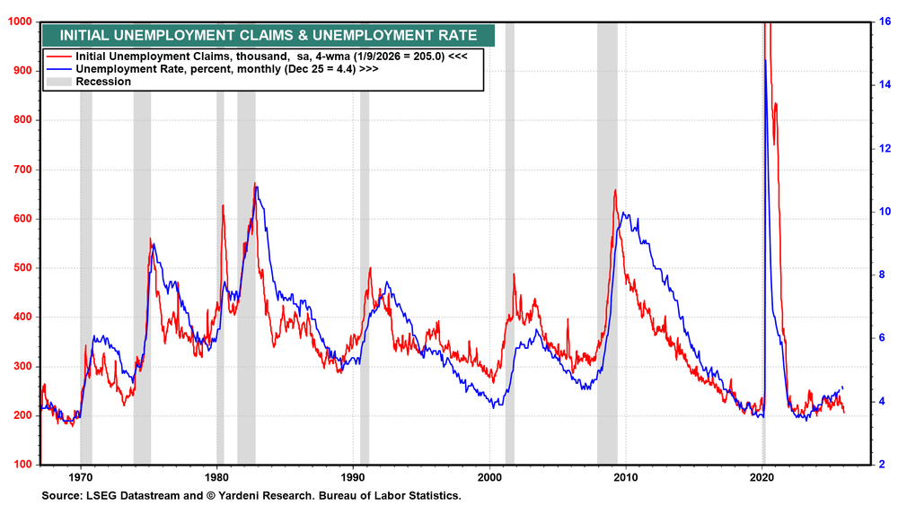 Initial jobless claims (Thu) have declined in recent weeks, indicating that January’s unemployment rate likely edged lower from December’s 4.4% (chart).