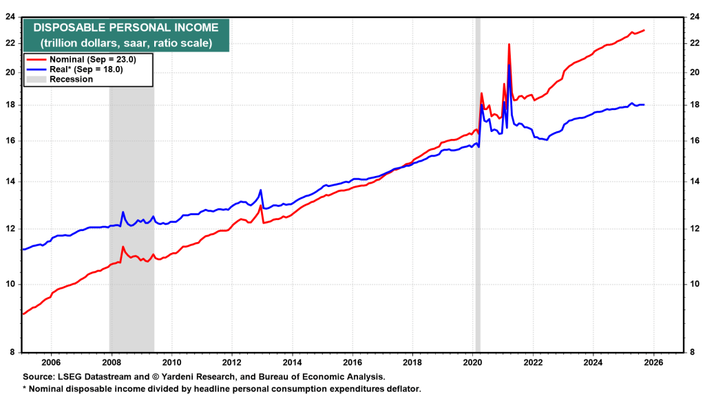 The Bureau of Economic Analysis will calculate October PCE inflation (Thu) using the average of September and November CPI data. Meanwhile, the Cleveland Fed’s Inflation Nowcasting model projects headline and core PCE inflation at 2.65% y/y and 2.70% in November (chart).