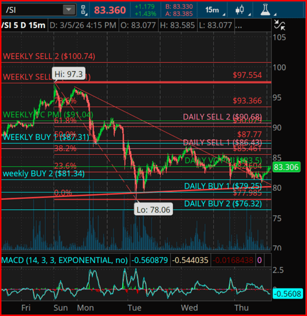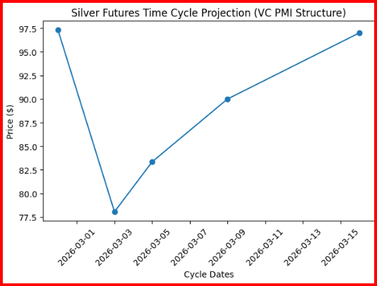 The time-cycle analysis indicates that silver is nearing a crucial short-term reversal window between March 6 and March 9, followed by another notable cycle expansion phase from March 13 to March 16. These cycles are derived from harmonic timing patterns that often coincide with liquidity shifts in futures markets. When such timing windows align with prices trading close to VC PMI support zones, the likelihood of a directional reversal tends to increase significantly.