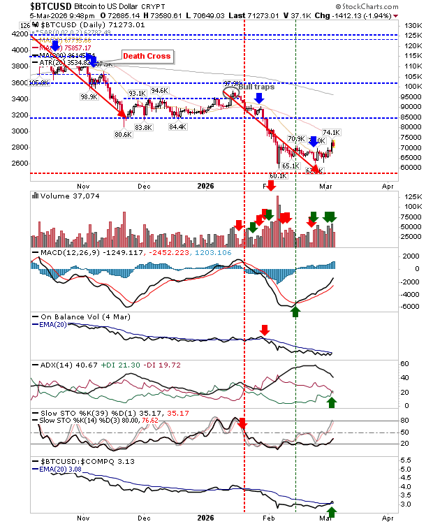 The next upside target is the 50-day moving average, followed by the $85,000 level, which is likely to align with a test of the 200-day moving average.