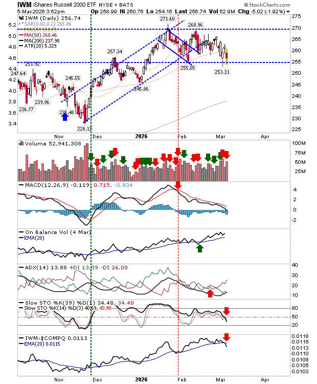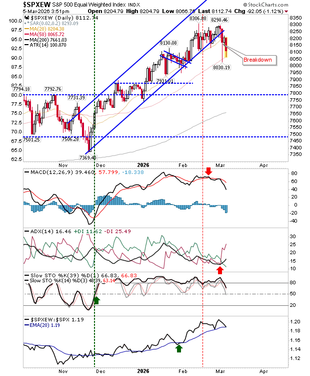 The equal-weighted S&P 500 may provide clearer insight into the market’s direction. It recently registered a clear trend break and has since completed two successful retests of its 50-day moving average. Given how frequently this level has been tested, a third retest would not be surprising—and that attempt could potentially lead to a breakdown below the 50-day MA.
