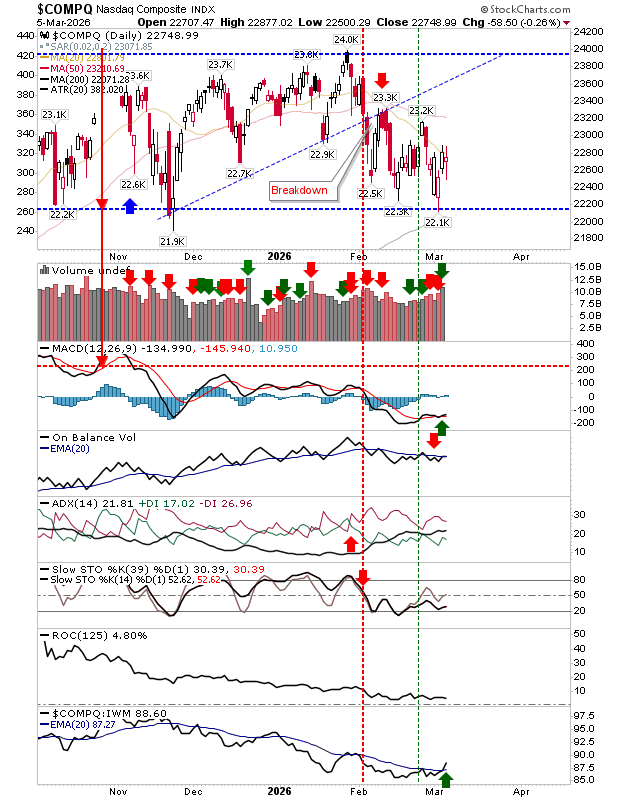 The Nasdaq is showing slightly better resilience compared with other major indices. Yesterday’s volume was classified as accumulation, indicating some buying interest. However, the 20-day moving average is currently acting as resistance and is quickly converging with range support and the 200-day moving average.