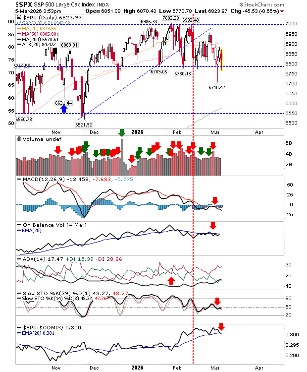 The S&P 500 is also approaching the lower boundary of its trading range, though it still has the early-week spike low acting as a reference level. Trading volume in recent sessions has remained relatively modest, but the broader technical picture has turned negative, highlighted by a newly formed downtrend in On-Balance Volume (OBV).