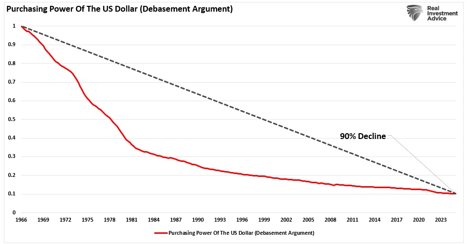 It’s an appealing storyline: inflation is spiraling, governments keep printing money, and the dollar is supposedly nearing its end. While there are legitimate risks to monitor, many headlines emphasize fear more than facts. The message can be powerful, especially when promoters of gold, silver, or other “doomsday” assets use it to push people into acting quickly. A commonly cited piece of evidence in this debasement argument is the familiar chart claiming the U.S. dollar has lost about 90% of its purchasing power since 1966.