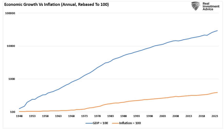 But here’s the key point: that chart doesn’t actually demonstrate currency debasement. It simply reflects inflation—an expected and well-understood feature of a growing economy. Prices tend to rise over time as demand increases, driven by population growth, higher incomes, and expanding consumption. This dynamic is particularly evident in a modern, service-based economy that encourages credit expansion and capital investment. In that sense, it’s not so much that the dollar is losing value, but rather that the economy itself is growing.