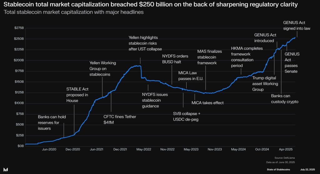 “Stablecoins have entered mainstream finance, creating a bridge between traditional banking systems and digital asset networks. Dollar-pegged tokens already process transaction volumes comparable to major payment networks, with activity rivaling systems such as ACH, Visa, and PayPal. By mid-2025, the total supply of stablecoins had surpassed $250 billion, highlighting growing demand for faster, always-available payment solutions.”