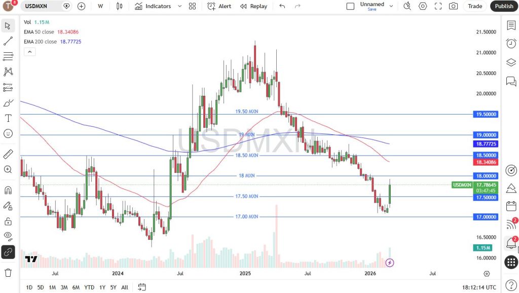 The US dollar surged sharply against the Mexican peso during the week, but in reality a pullback had been due. The key question now is whether the 18-peso level will act as strong enough resistance to reverse the move.