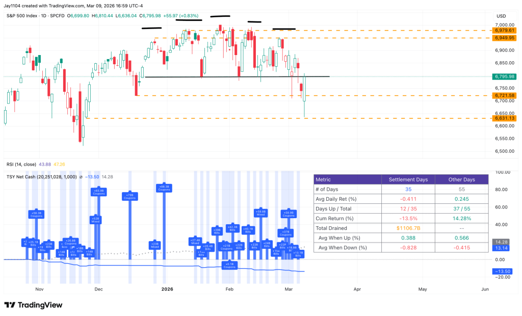 From a bullish perspective, however, one key challenge remains. Today marks the settlement of roughly $15 billion in Treasury bills. Historical data indicates that markets rise only about one-third of the time on settlement days, while in roughly two-thirds of cases equities tend to decline.