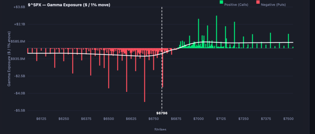 From both an options-market and technical-analysis standpoint, 6,800 is a key level. If the SPX moves above it, the index could quickly advance toward 6,900, which corresponds to the zero gamma level.