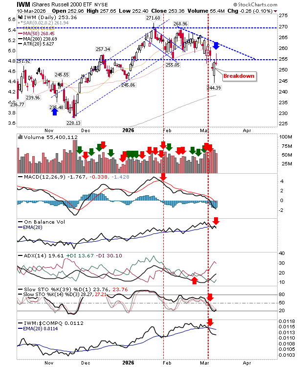 Even so, the pattern may present a shorting opportunity, particularly after the index failed to secure a close above the $255 level. A prudent risk management approach would place stops on a high-volume move above $258.