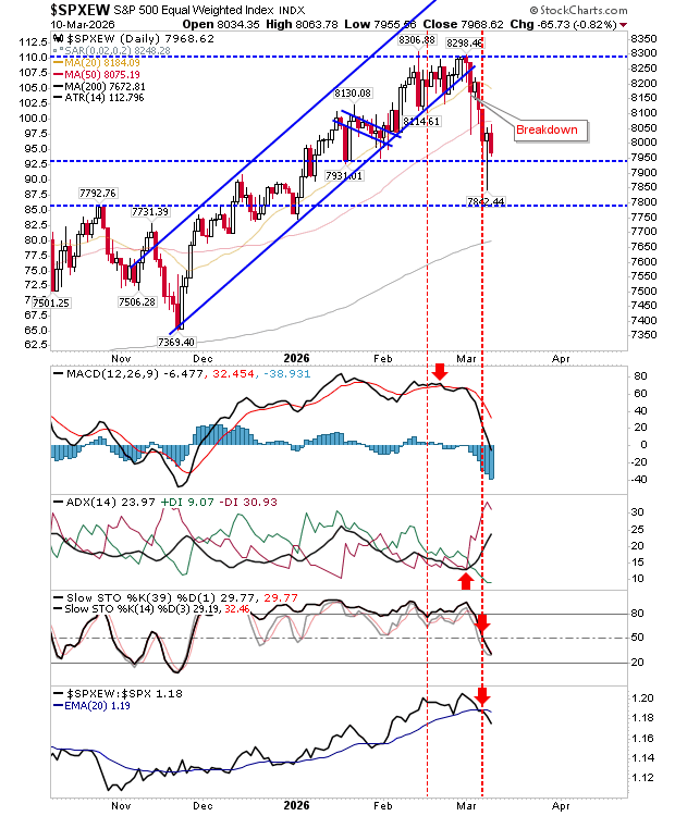 The S&P 500 Equal Weight Index moved close to the 7,800 support level, which could develop into the next key floor for the emerging trading range.