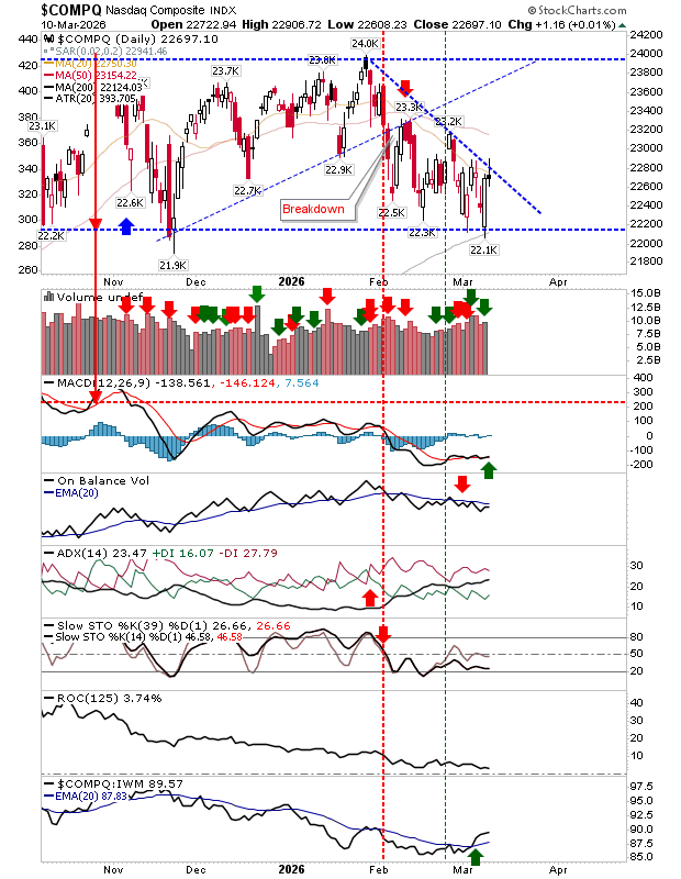 Although there is a weak buy signal present, several other indicators remain bearish. This cautious outlook persists despite the Nasdaq’s recent surge in relative performance compared with the Russell 2000, often tracked through the iShares Russell 2000 ETF.