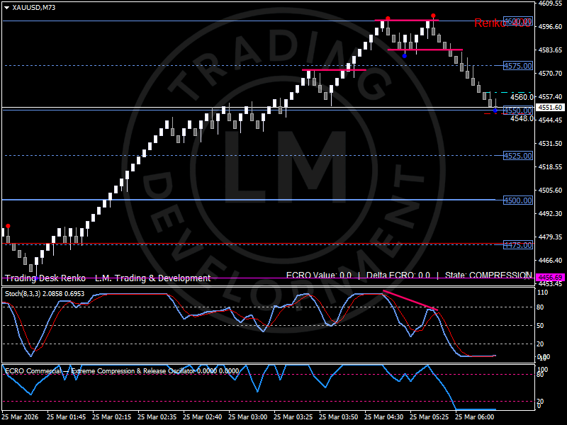 The Renko structure highlights the sequence clearly. Gold’s advance into the upper $4,500s reached an exhaustion zone just below $4,600, where upward momentum faded and supply returned. The subsequent pullback pierced the upper structure, removing the previous layer of support.