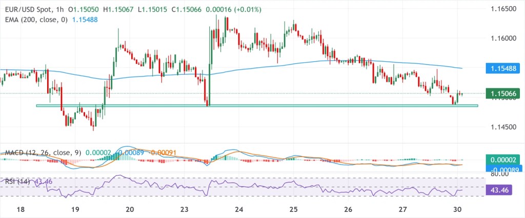 Technically, the short-term outlook remains slightly bearish, with prices staying below the flat 200-hour EMA near 1.1550. Momentum indicators show indecision, as MACD hovers around neutral levels and RSI sits near 43, indicating a mild seller advantage without strong downside momentum.