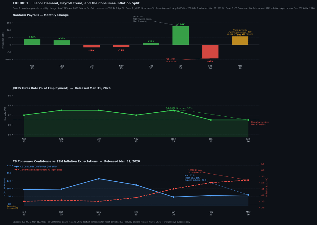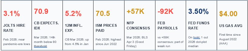The three panels together lay out the core evidence. The first highlights a choppy payroll trend with several negative prints, and even if March meets expectations, hiring remains subdued. The second shows that the drop in the hires rate is not just monthly noise but a structural shift—hovering near pandemic-era lows while separations stay relatively stable, meaning the weakness is concentrated in reduced hiring. The third panel captures the real tension: consumer confidence from the The Conference Board came in stronger than expected at 91.8, yet the Expectations index sits at 70.9, below the recession signal threshold for 14 straight months. At the same time, 12-month inflation expectations climbed to 5.2%. Households are both pessimistic about growth and anticipating higher inflation—a mix that limits the Fed’s flexibility. Cutting rates risks reinforcing inflation expectations, while holding steady risks deepening the slowdown.