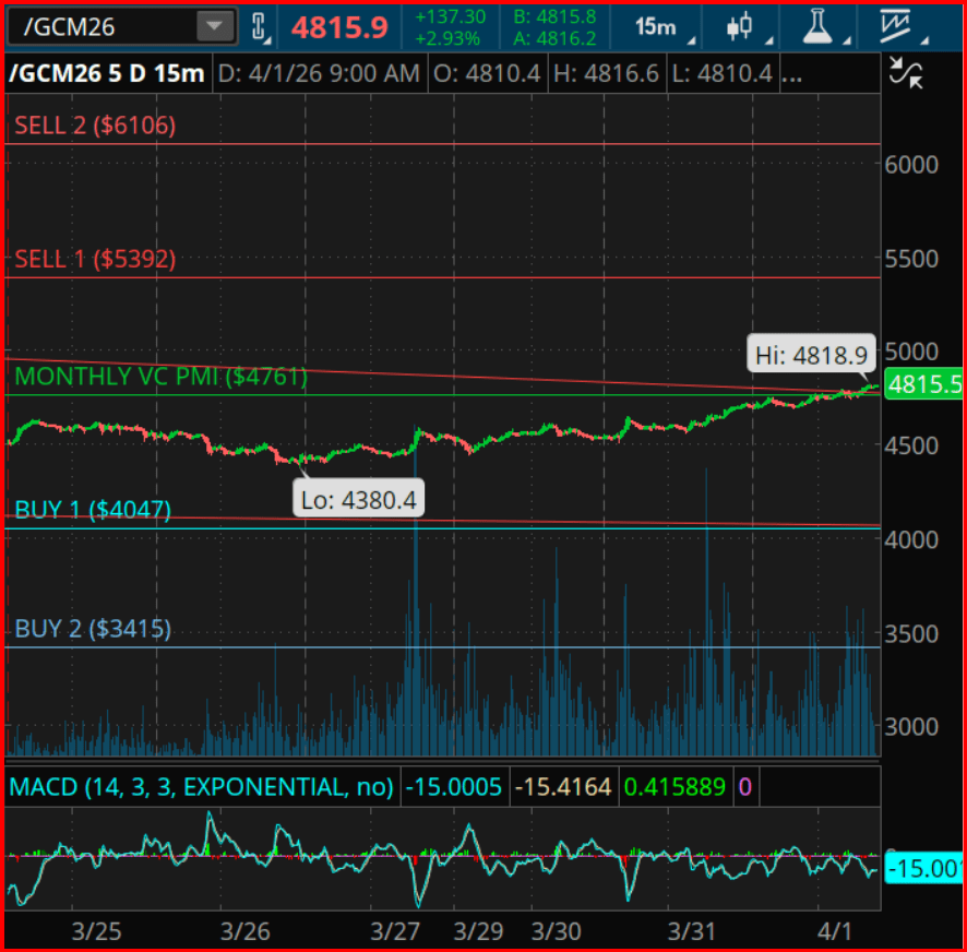 Gold futures continue to display a strong bullish monthly structure, with momentum remaining firmly upward as prices hold above the VC PMI mean at $4,761. This level acts as a key equilibrium point, and sustained trading above it is typically interpreted as a sign of institutional accumulation and ongoing trend strength.