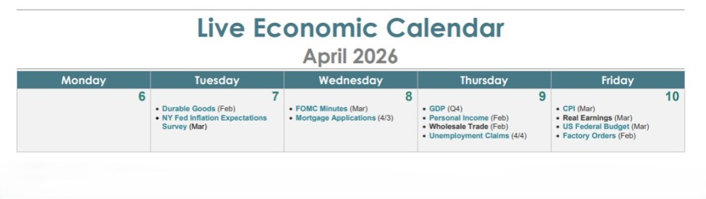 The March 17–18 Federal Reserve minutes (Wednesday) will provide insight into how policymakers viewed the early phase of the conflict. Meanwhile, the March CPI report (Friday) will offer the first indication of how rising gasoline prices are feeding into broader consumer inflation.