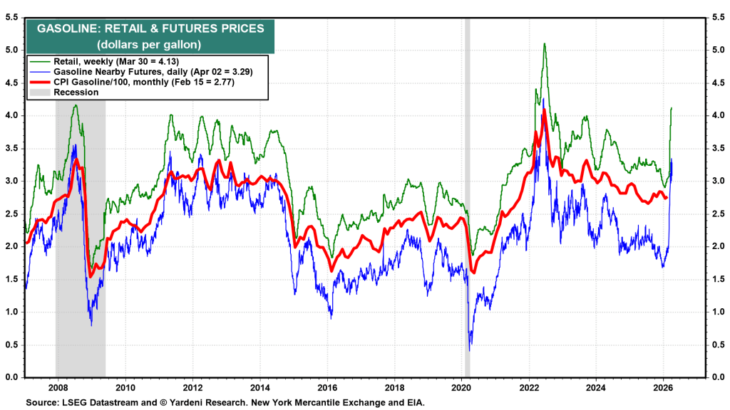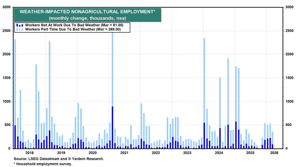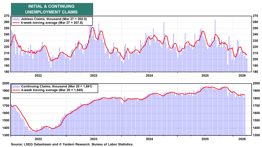 Friday’s payrolls report surprised to the upside, providing reassurance about the near-term strength of the labor market. Initial jobless claims (Thursday) have continued to trend lower, with the four-week moving average at 207,800 (see chart). So far, claims data show no signs that the war is weakening labor market conditions.