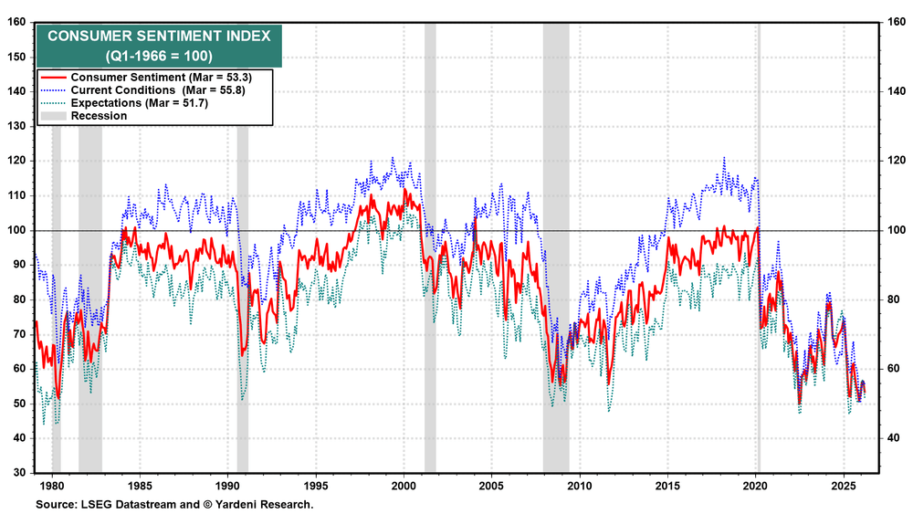 The preliminary University of Michigan Consumer Sentiment survey for April is expected to ease to 52.0 from 53.3 in March, with expectations already subdued at 51.7 (see chart). Meanwhile, The Conference Board consumer confidence surprised to the upside last week at 91.8, suggesting sentiment may be more resilient than consensus expectations imply.