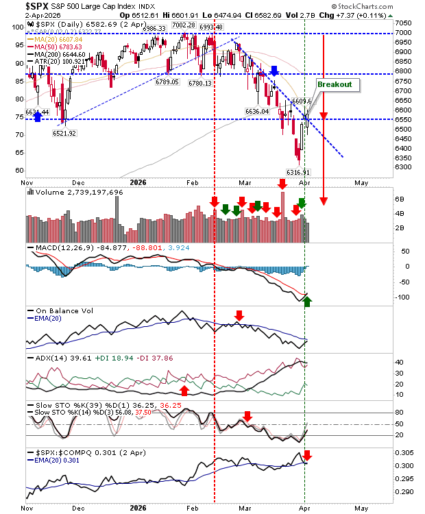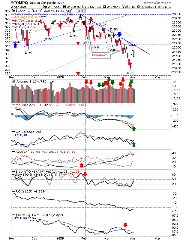 Markets tilted back toward buyers, but it’s still too early to call a sustained rally. The S&P 500 led the move, breaking above downtrend resistance, though it has yet to test its 20-day moving average. A fresh MACD buy signal emerged, but its strength remains questionable as the indicator is still below the zero line.
