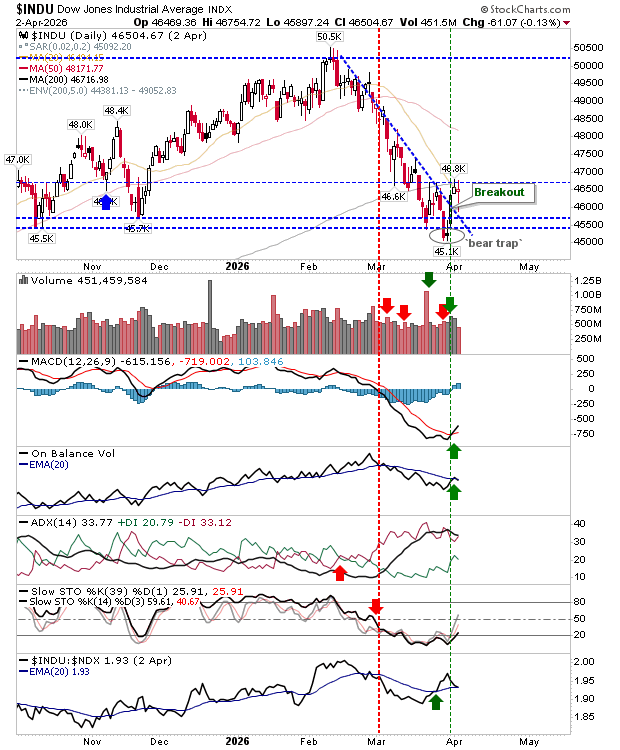 The Dow Jones Industrial Average has successfully back-tested its breakout and held above the 20-day moving average. The next step is a push toward the 47,000 level. The move is supported by buy signals in both MACD and On-Balance Volume, with the index also outperforming its peers.