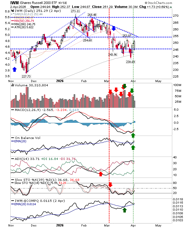 The Russell 2000 (IWM) closed above its 20-day moving average but still needs to overcome more meaningful resistance at prior highs. After holding firmly above its 200-day MA, it has generated fresh buy signals in both On-Balance Volume and MACD. The index is also showing relative outperformance versus its peers.