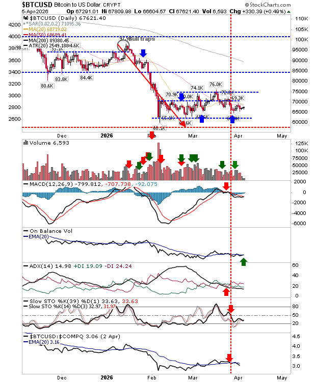 Bitcoin has seen little change in its overall setup, but still tilts in favor of the bulls and may offer a trading opportunity. From a technical standpoint, there’s a confirmed buy signal in On-Balance Volume and a potential buy trigger emerging in the MACD.