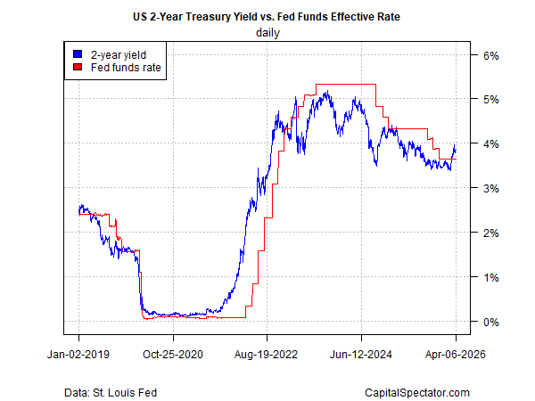 Meanwhile, the Treasury market has shifted its expectations. After a prolonged period of dovish positioning, investors are now assigning a higher probability to near-term rate hikes. This shift is evident in the policy-sensitive 2-year Treasury yield—around 3.84% as of April 6—trading above the median effective Fed funds rate of 3.64%, signaling a renewed tilt toward a more hawkish outlook for the first time since 2022.