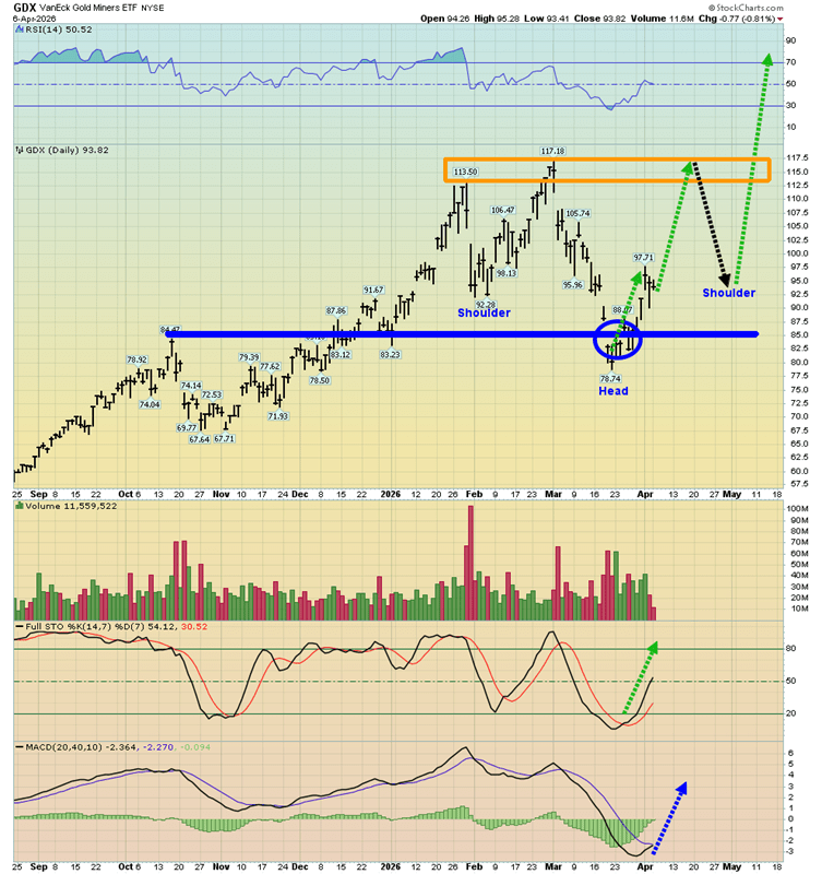 And what about the miners? The GDX chart looks particularly impressive, with a clear inverse head-and-shoulders pattern forming. The head developed around the critical $85 support level, where the 14,7,7 Stochastics oscillator also signaled a bottom.