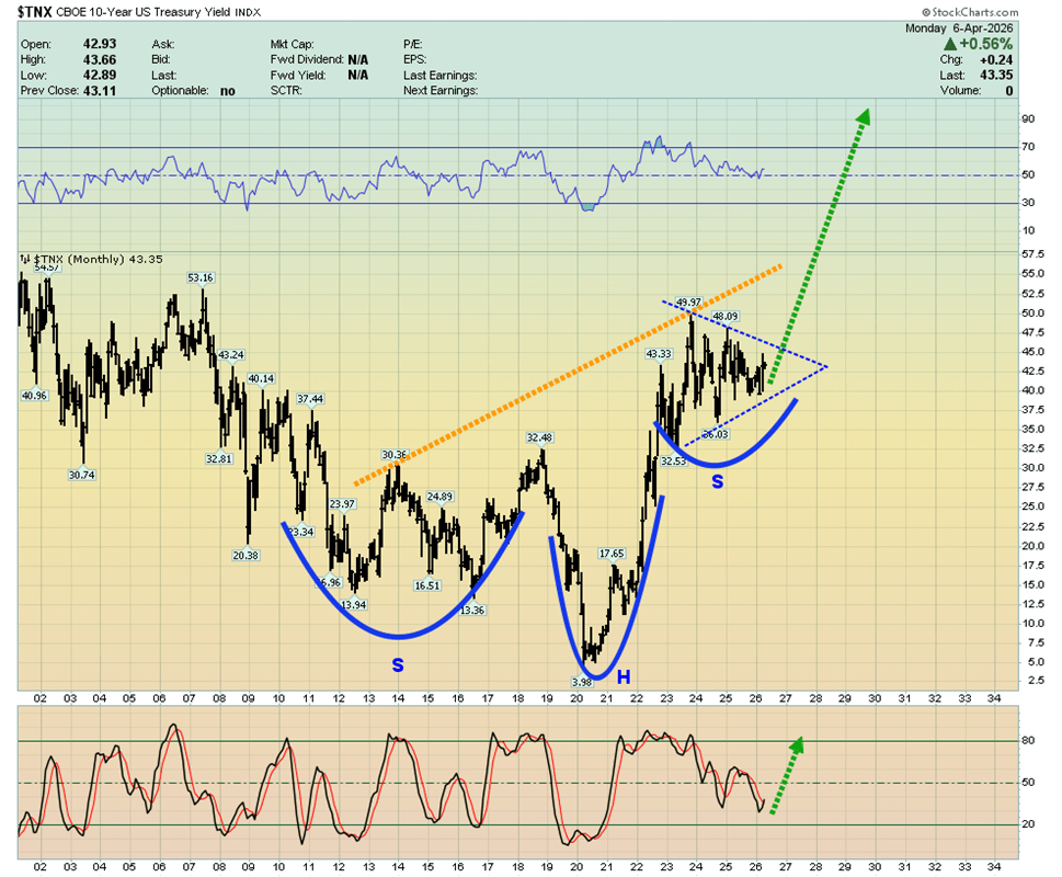 The U.S. interest rate chart is drawing attention, with what appears to be a large inverse head-and-shoulders pattern suggesting a potential move toward the 7%–8% range.