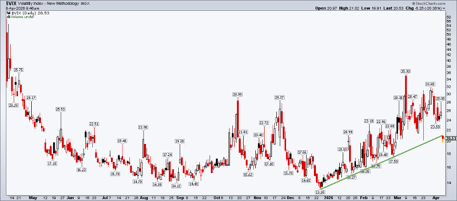 However, that trend has recently reversed following the temporary reopening of the Strait of Hormuz. The VIX has now broken its multi-month uptrend and recorded a clear lower low. Despite heightened expectations, volatility never reached the dramatic spike many anticipated—it topped out just above 35, only nine days after the Iran conflict began. The combination of high volatility, surging oil prices, and poor investor sentiment made March particularly challenging.