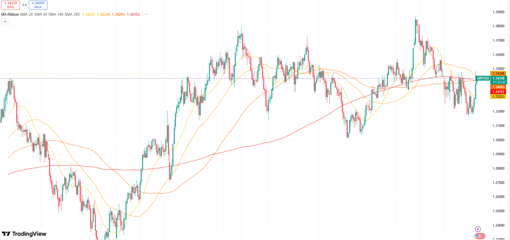 The short-term outlook for GBP/USD has shifted slightly bullish, with the pair maintaining its position just above the 38.2% Fibonacci retracement of the January–March decline. Price action is currently challenging the downward-sloping 200-day Simple Moving Average around 1.3415 from below, indicating early signs of buying interest near this key long-term level. Momentum indicators are also improving, as the MACD line has crossed above its signal line and is moving back toward the zero line, while the RSI at 55 reflects moderate bullish momentum without overbought pressure.