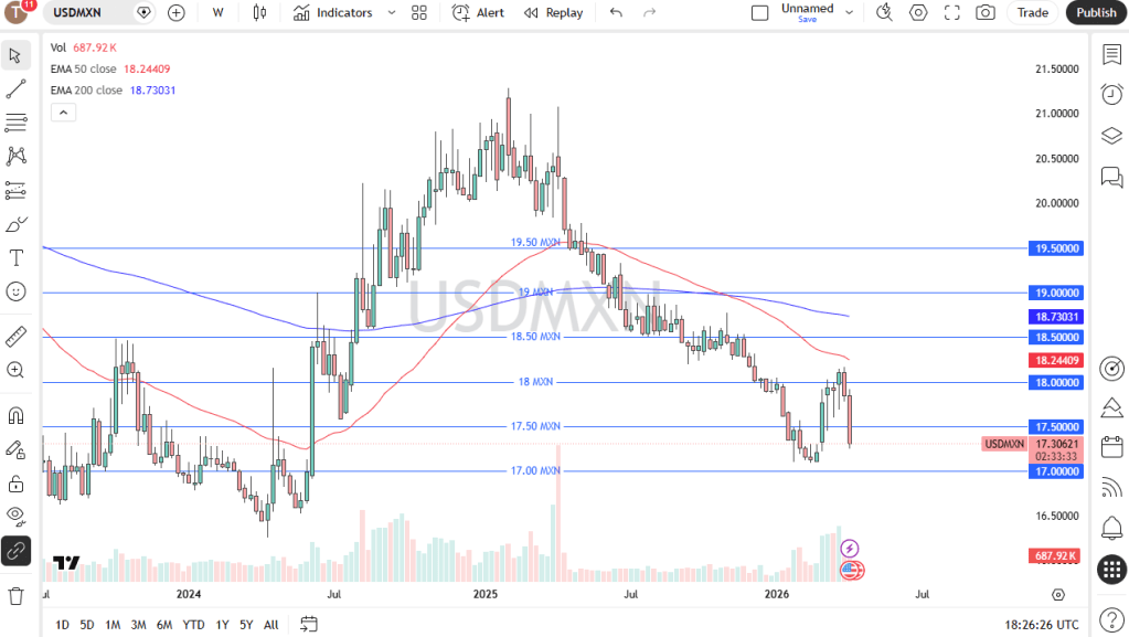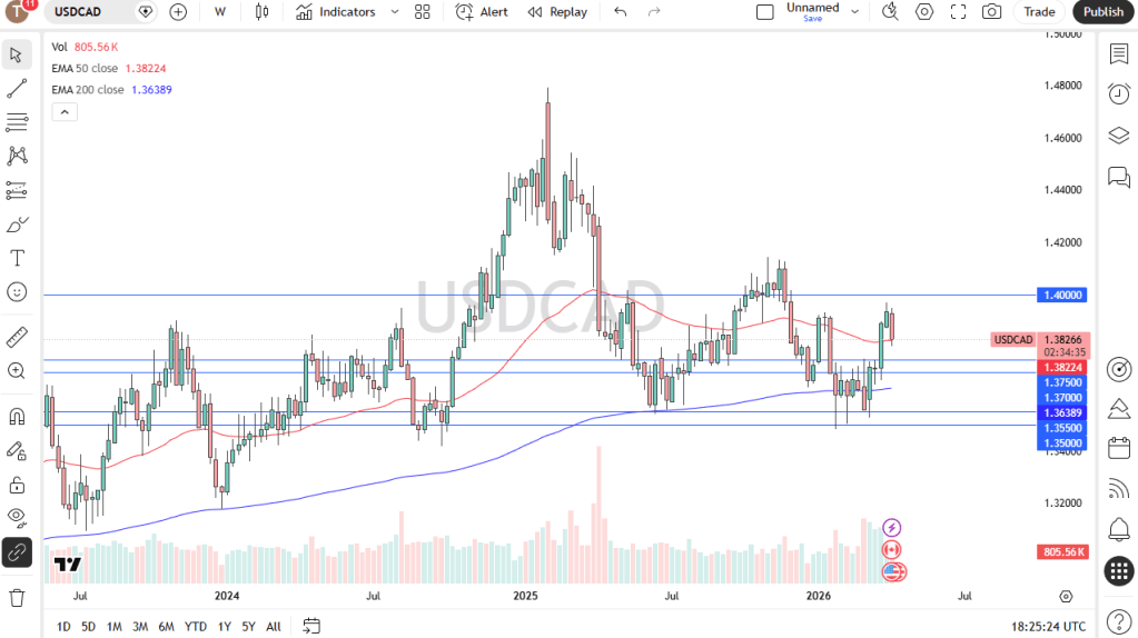 The US dollar has declined against the Canadian dollar and is now hovering around both the 50-week EMA and the 200-day EMA, making a pause at this level quite reasonable. As with other markets, Monday’s open will likely be influenced by developments in Islamabad. Overall, this appears to be a market attempting to establish support before potentially moving higher. The 1.3750 level stands out as a key area to watch for a possible bounce if the pair continues to pull back, while the 1.40 level remains a significant resistance to the upside.
