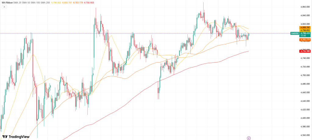 Gold continues to trade in a narrow range below the $4,800 mark early Friday, failing for a third straight day to hold above that level. Market participants remain cautious as they await clearer direction from upcoming US–Iran peace talks, while the metal still looks set for a fourth consecutive weekly gain.