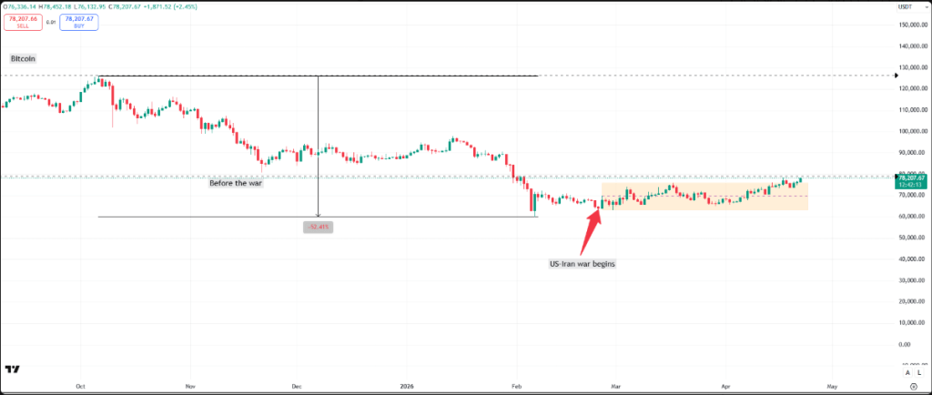 That said, the US–Iran war began after Bitcoin had already undergone a steep correction of more than 50% from its all-time high prior to February 28.