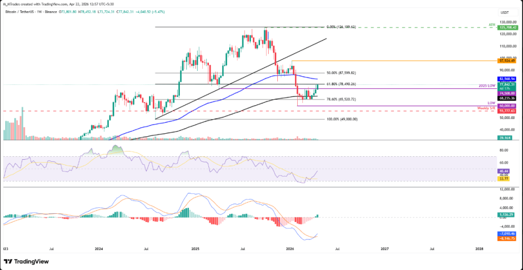 Bitcoin’s technical structure is starting to show constructive signals. The leading cryptocurrency gained 4.33% last week, reaching an 11-week high near $78,333, and has extended those gains by more than 5% this week. Price is այժմ approaching the key 61.8% Fibonacci retracement level around $78,490, measured from the August 2024 low (~$49,000) to the October 2025 all-time high (~$126,199).