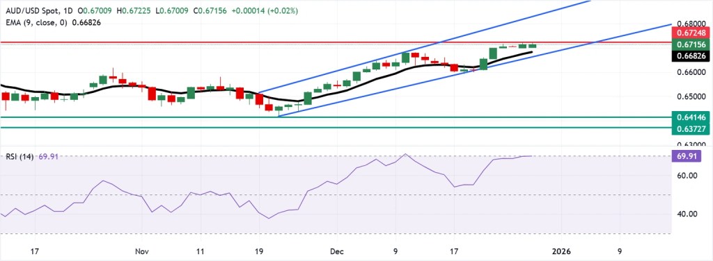 AUD/USD hovered around 0.6720 on Monday, maintaining an upward trajectory within an ascending channel pattern on the daily chart, signaling a persistent bullish bias.
