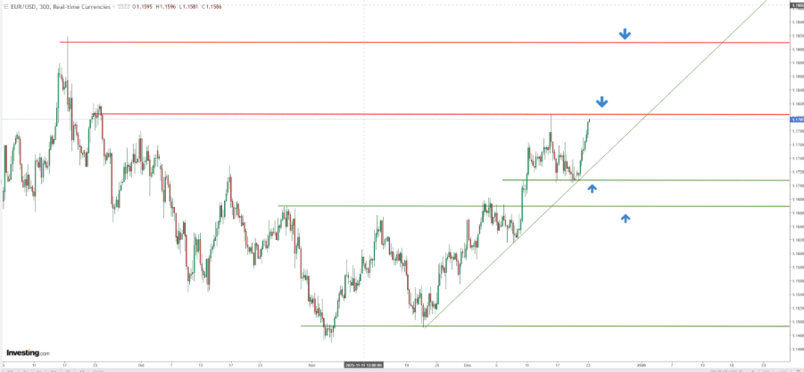 The critical resistance level for EUR/USD is the December high near 1.1800. Should today’s data weaken the US dollar, a breakout above this level could occur, paving the way toward 1.19 in the early weeks of the new year