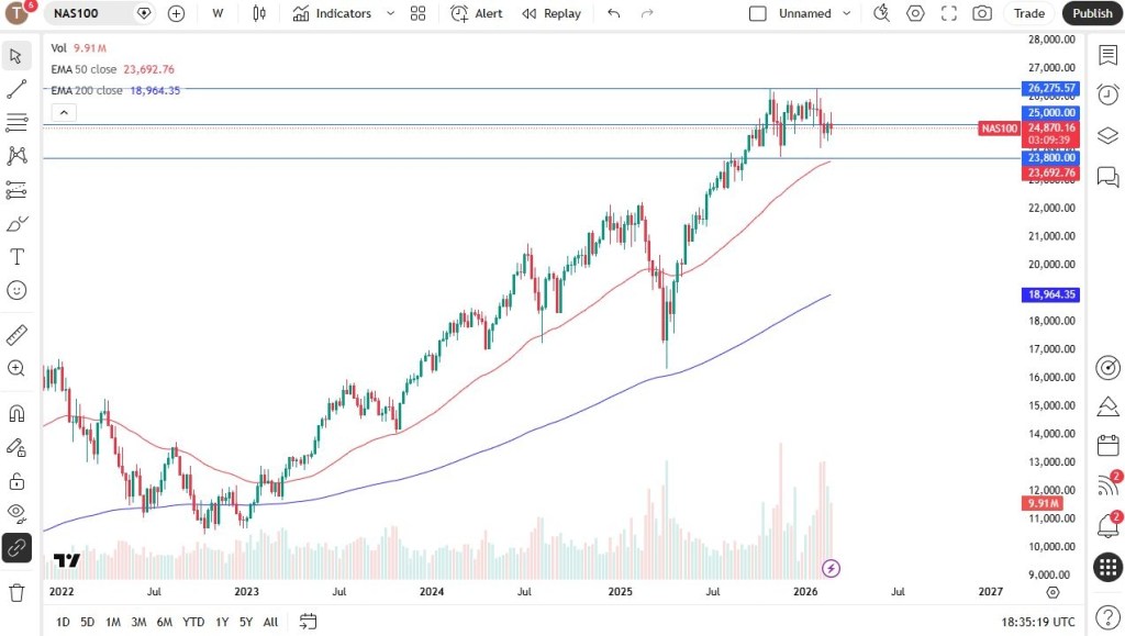 The Nasdaq 100 has experienced significant volatility throughout the week. Despite ongoing challenges and heavy selling pressure in major stocks such as Nvidia, the index is set to close the week in relatively steady shape. The 25,000 level remains a key focus, as it represents a major psychological milestone.