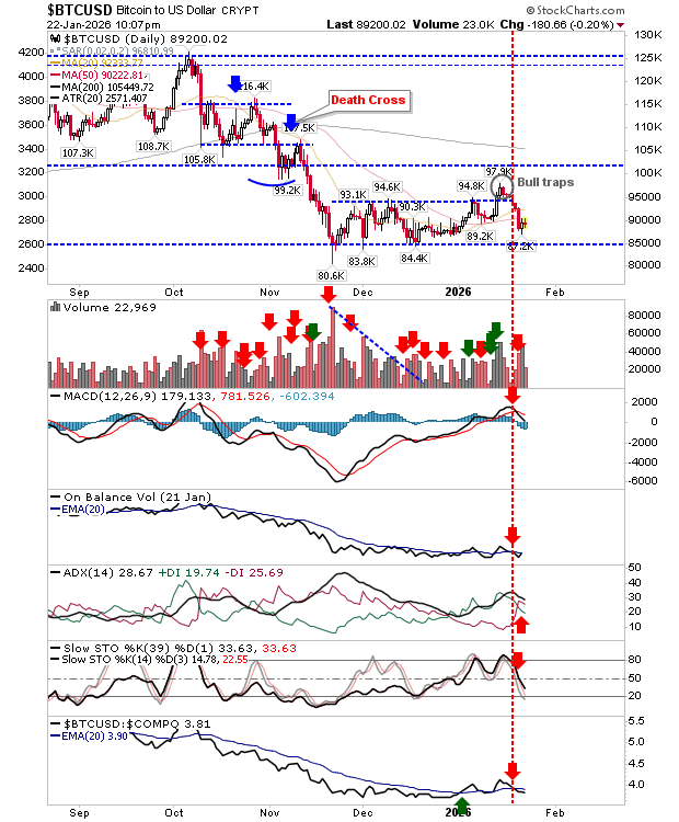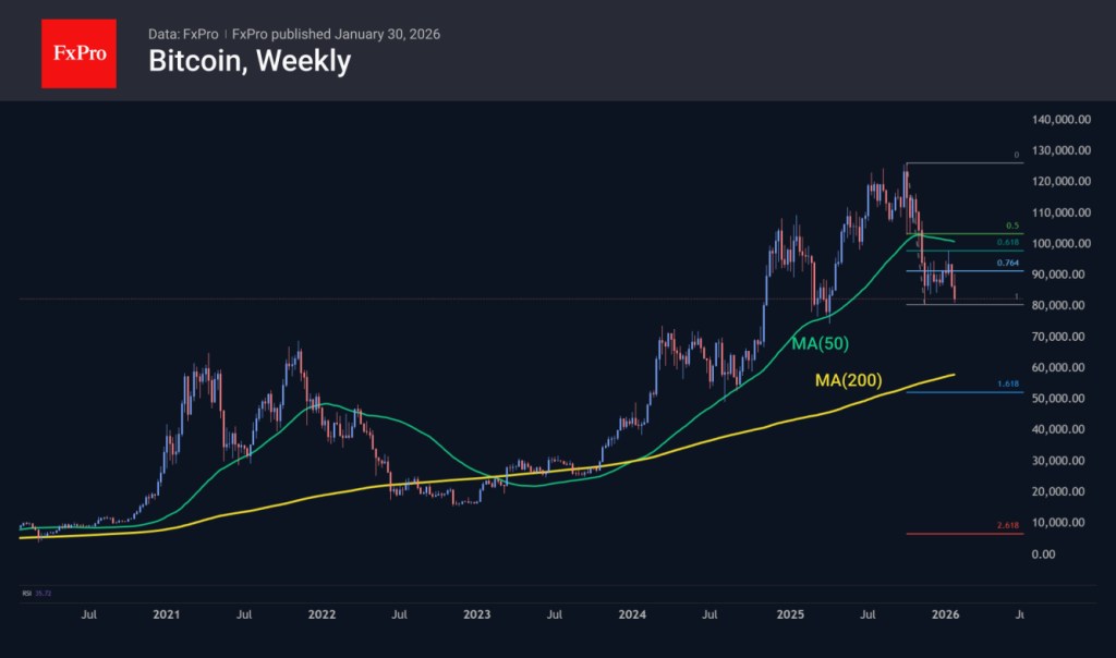 The total cryptocurrency market capitalisation dropped by about 5% to $2.82 trillion over the past 24 hours, briefly touching $2.78 trillion twice—its lowest level since April last year. As anticipated, weakness in commodity and equity markets added further pressure to crypto, triggering a sell-off on elevated volumes as traders tightened stop-loss orders after a prolonged period of consolidation. In our worst-case scenario, market cap could fall into the $1.8–2.0 trillion range, corresponding to a 161.8% extension of the initial downside move seen in October–November.